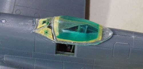 今度はキャノピーとスピナーです(TT) 「さあ、塗装だ!」と意気込んで、風防・キャノピー・コックピット周りに エアブラシの塗料が回り込まないようにして吹こうとした時 (コックピットドアの空間は”B11”の部品を使ってマスキングの替りにしました) 「…
