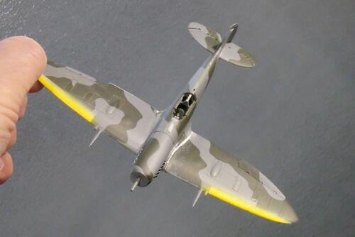 主翼前縁を整形し、識別帯をエアブラシで塗装しました。 下地No62艶消しホワイト、その上からNo58黄色です。 その上からマスキングして迷彩塗装にそなえます。 せっかくエルロンが別部品になっているので、バンクしているシーンにでもしようかと(^^;。 (…