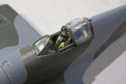 風防のダボを切り取った後、とにかくひたすら磨き続けます。 パイロットには例のレポート用紙の細切りで、シートベルト(みたいなもの)を追加しました。 ガンサイトのなんちゃってプロジェクターを塩ビの細切れで追加です(^^;。 なんやかんやで1時間近くこ…