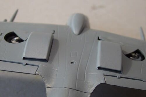 主翼下面のラジエターはかくの如しです(^^; フラップもパネルラインも「な~んもなし」でおまけに平べったい。 無視して作業続行します(汗) 排気口に合った厚さ(薄い)塩ビ板をカットしてみましたが...。 機体からはみ出ていますし、形状的に強度不…