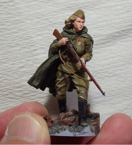赤軍女性狙撃兵”とり完”しました スケール違いへのわだかまりと言うか、残念な気持ちは変わりませんが それはそれとして、製作したつもりです。 ちょっと汚し過ぎましたかねぇ(^^; 「絵になる、カッコいいポーズ」と思うのですが ボルトを操作(装填動作)し…