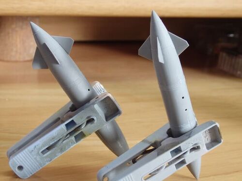 金太郎飴のような製作記が続いていますが、今少し我慢して下さいませ(^^; ドロップタンク(大)に小翼を取り付けました 結局、給油口?のEPは切り取って無しにしています フィンが4枚全て別パーツなので、歪みのない十字にするのに気を使いました 搭載物の…