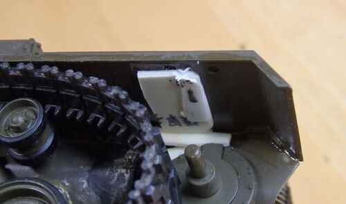新旧M48入り乱れての製作記になってしまってます 分かりにくくまた見にくいと思いますがご容赦の程を<(^^;)> 【旧の方の車体です】 とにかく履帯です この弛みを何とかしなければなりません 取り敢えず上の浮き上がりを抑えようと、フェンダー下にプラ板を…