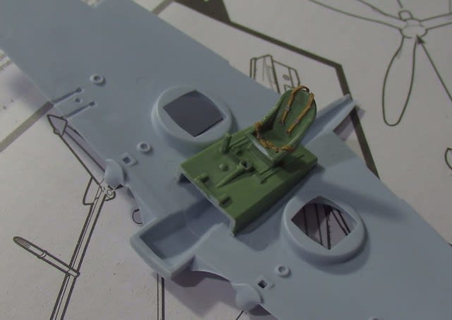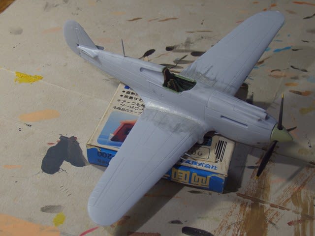 ペラとスピナーも塗装して取り付けて、エンジン上部カバー(機銃口は穿孔)を接着します、息を吹きかけると回転します(気持ちいい)。