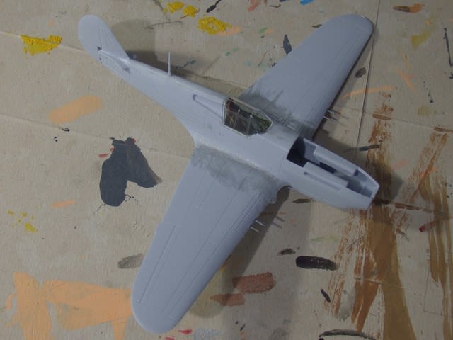 主翼上面とフィレットの接合部に若干段差と隙間が生じたので、Mr溶きパテで埋めサンディングしながらNo8シルバーで確認です。
