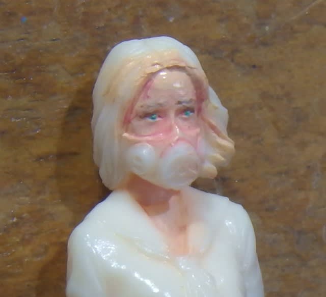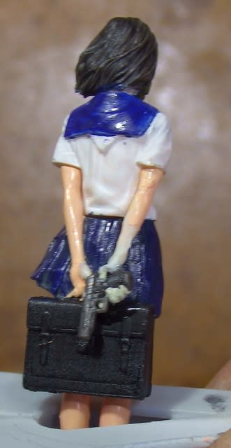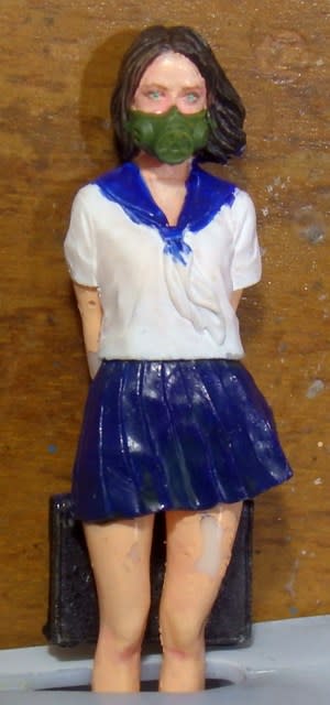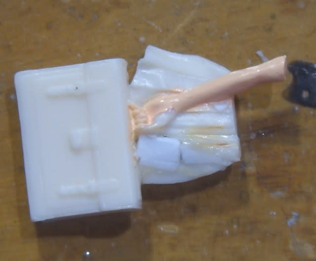 スカートと手提げかばんが一体彫刻されているので、ここから腕を切り出し、後をプラ板で穴埋めします。