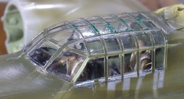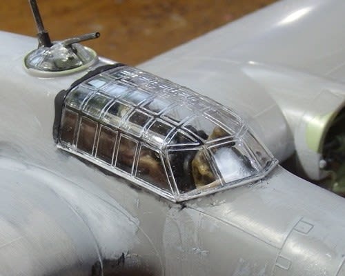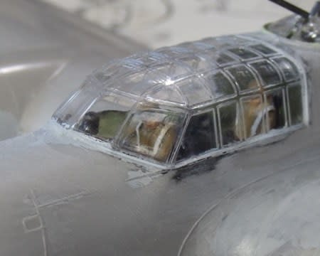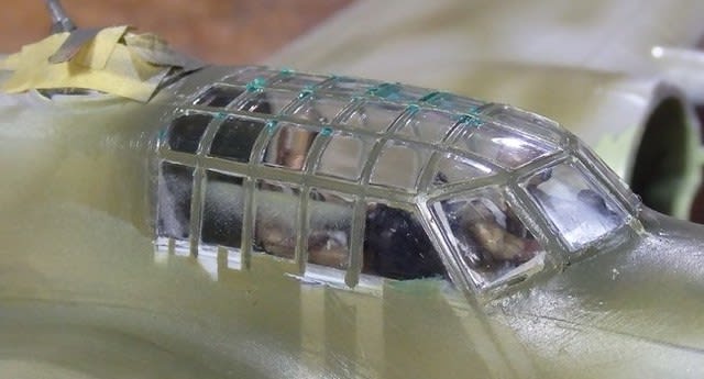 指で押さえていたら、押し出された接着剤がキャノピー全面の右側に...