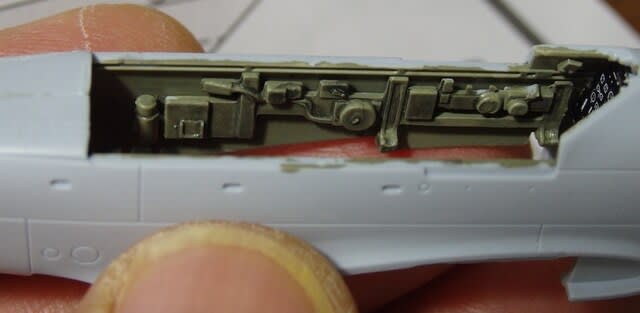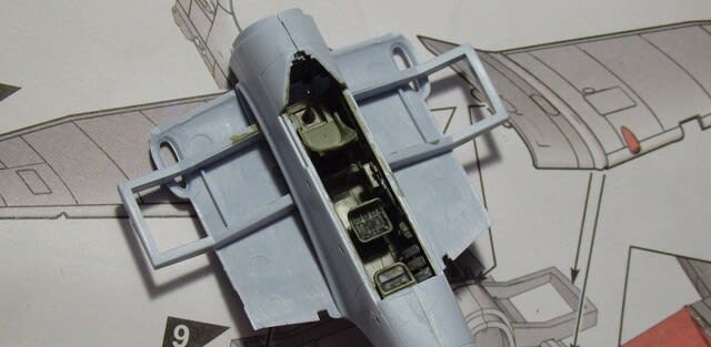 主翼下面の基部に、シートや操縦桿を付けたコックピット床を接着します