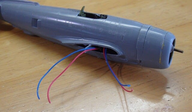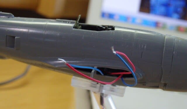 主翼の接着部がポッカリ開いてます、ここからコードを引き出して切断します