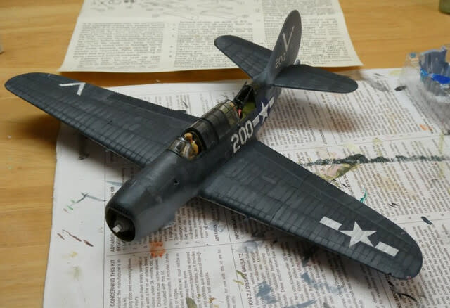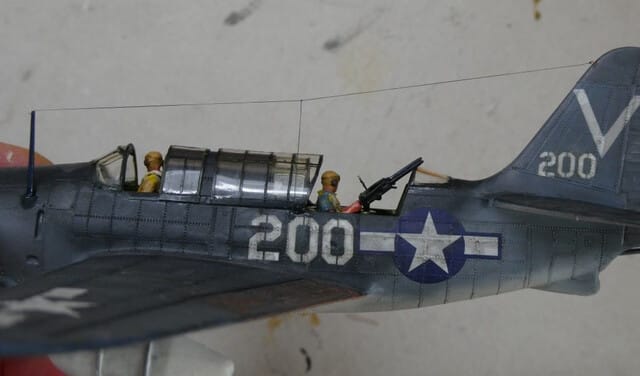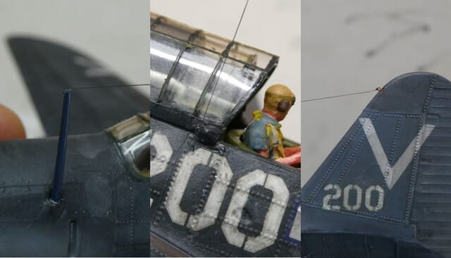尾翼とアンテナ支柱間を貼った後、胴体に植え込んだものを接続して端をカットして出来上がりです