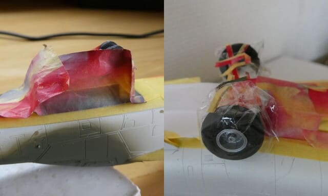 左が前脚、右が主脚のマスキング状態ですが...うまく塗装できるか不安(;'∀')